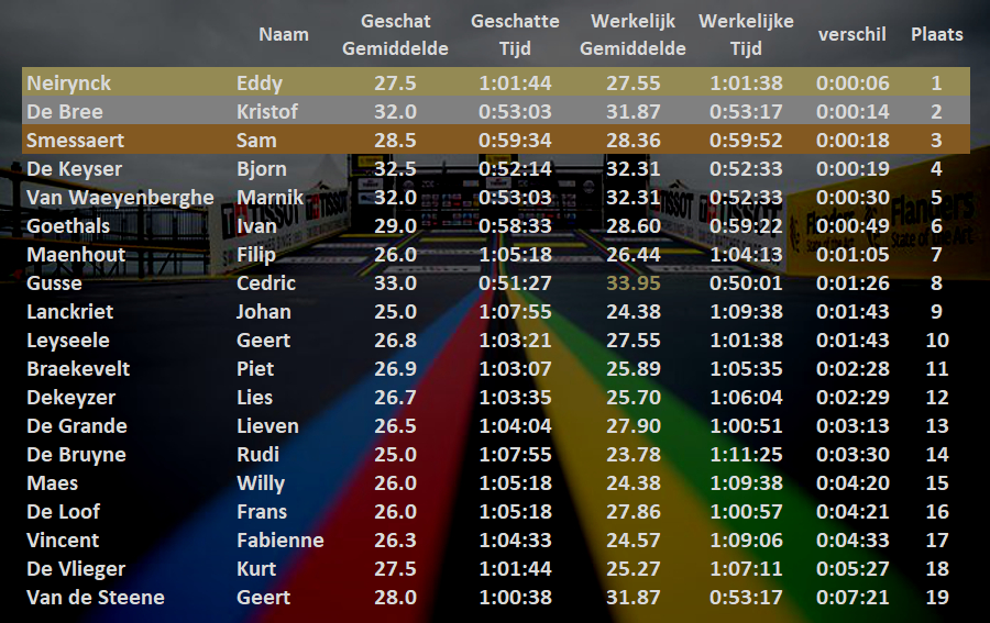 Deze werd gereden over 3 ronden van elk 12.7KM rond Knesselare, degene die zijn geschat gemiddelde het dichts